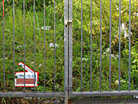 eine Restgrünfläche zwischen den Bahnbrücken. Zwischen weggeworfenen