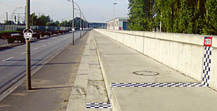 eine lange Flutschutzmauer, die stark an die Tribüne einer Rennstrecke