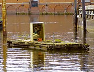 Ein Floß liegt vor dem Landungssteg. Auf ihm steht eine Transportkiste,