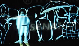 Filmsequenzen projeziert. Auch der Zeichner übermannshoch auf den