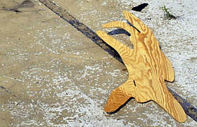 Aus Sperrholz geschnittene Tierfelle an Zäunen und am Boden weisen den