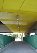 hellgraue Silos, gelbe Brückengeländer, schwarze und olivgrüne