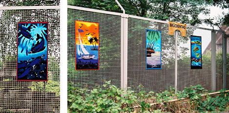 Am Zollzaun unter der Köhlbrandbrücke sind vier Badetücher befestigt.